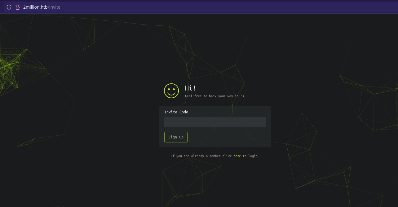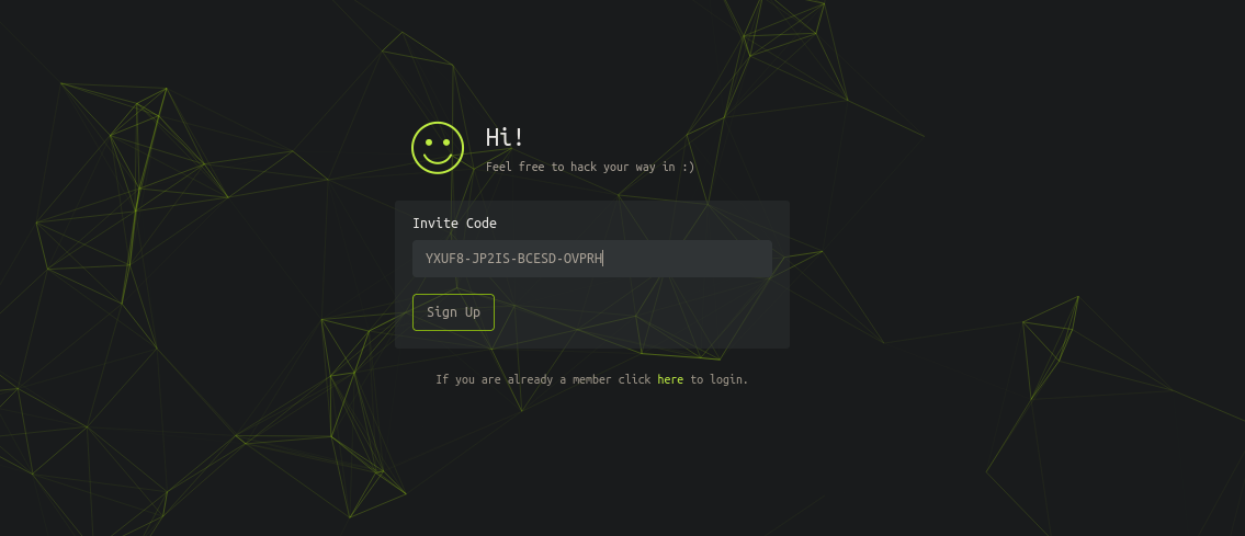 La web es un rompecabezas en el que tenemos que obtener un código de invitación para poder registrarte en la misma y obtener acceso.