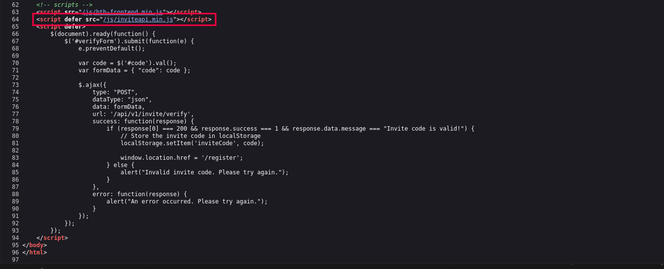 Si nos vamos a la página http://2million.htb/invite y examinamos el código fuente con Ctrl+U veremos la función en JS que se ejecuta por detrás.