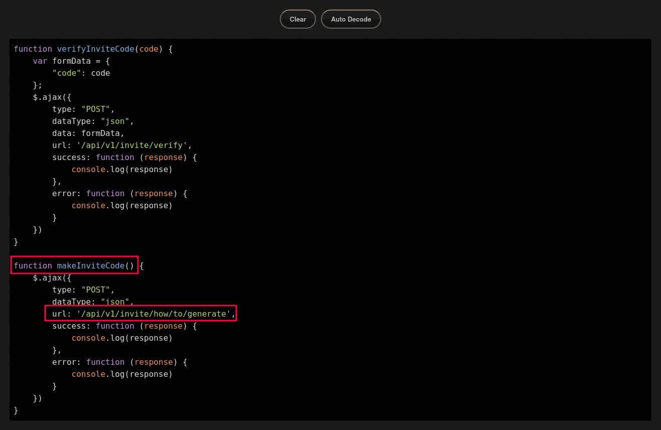 Encontramos una función llamada “makeInviteCode()” y una URL a la que poder enviar un POST para generar supuestamente el código que estamos buscando.