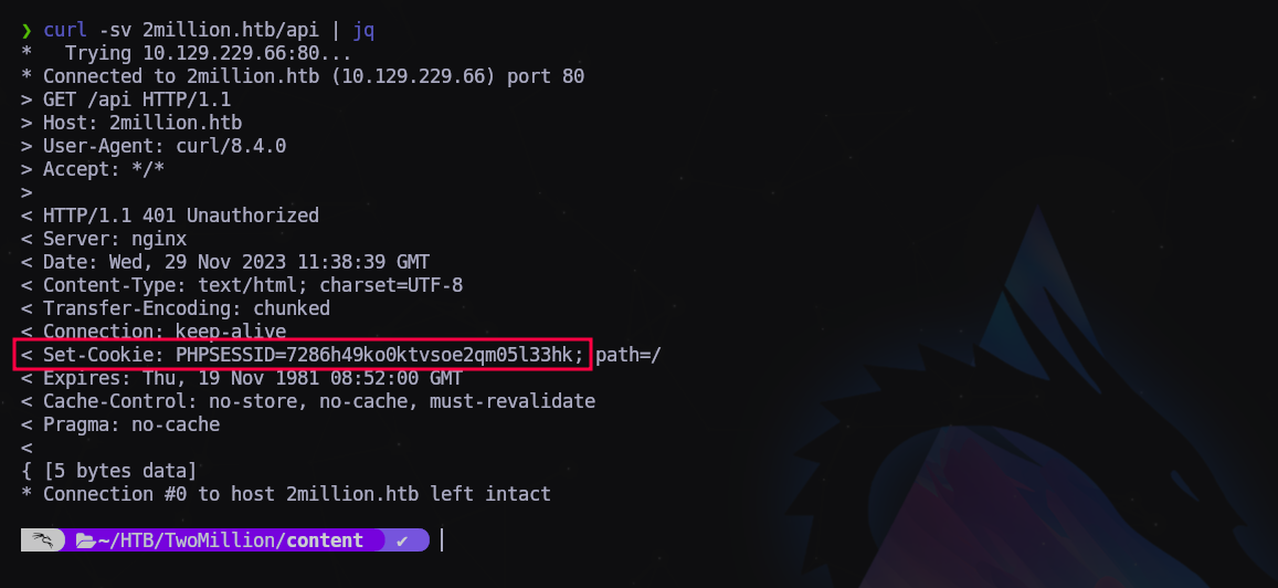 $ curl -sv 2million.htb/api/v1 --cookie "PHPSESSID=7286h49ko0ktvsoe2qm05l33hk" | jq