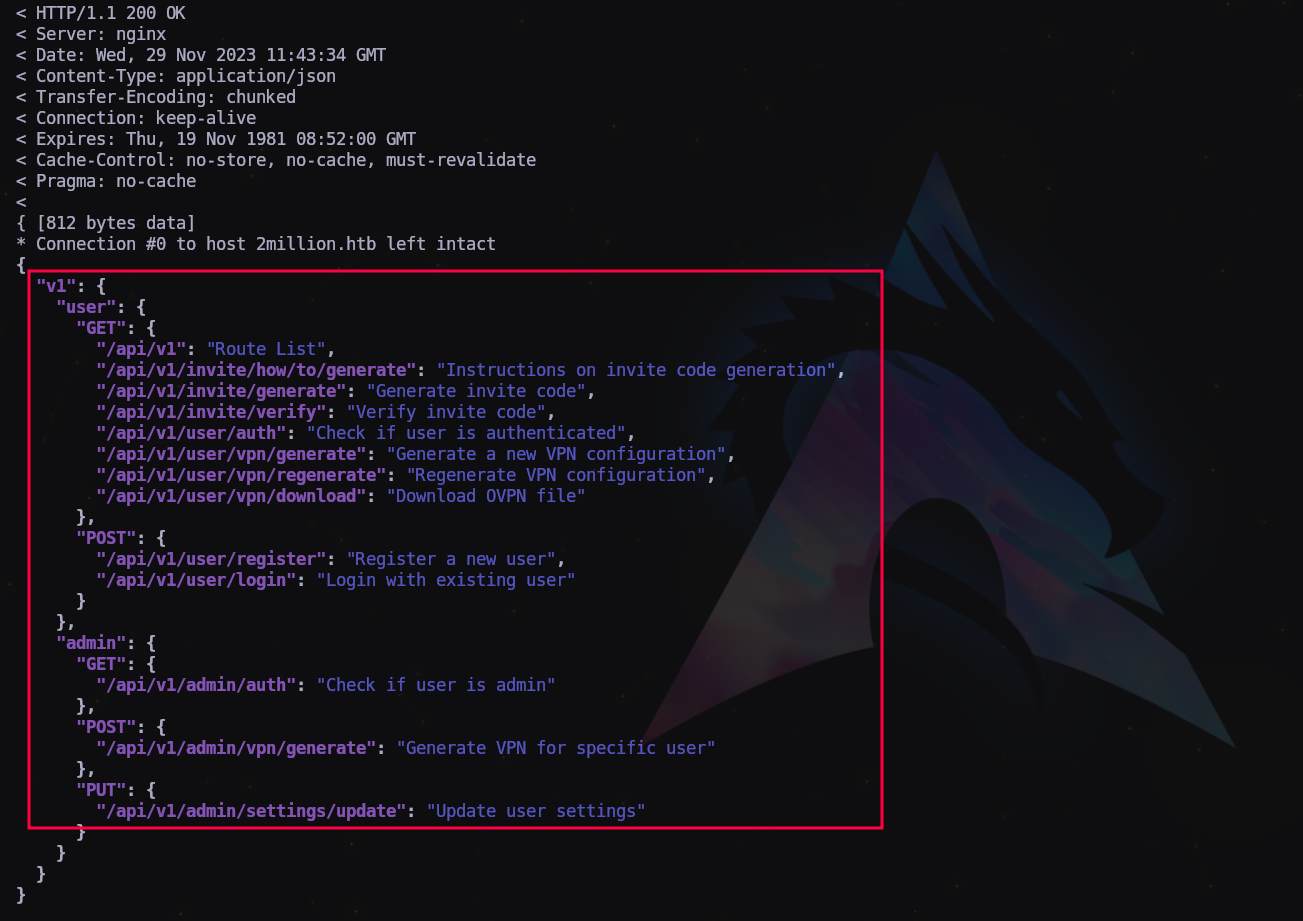 $ curl -sv 2million.htb/api