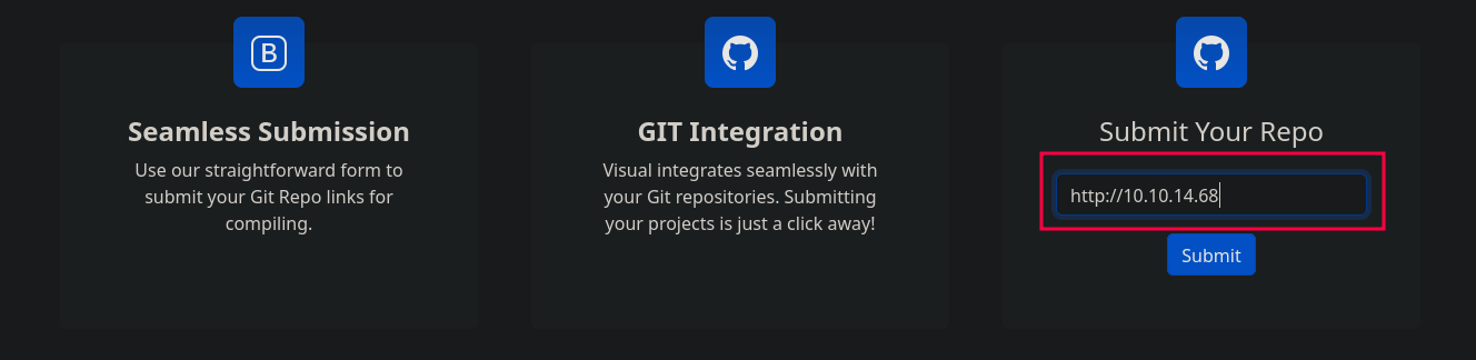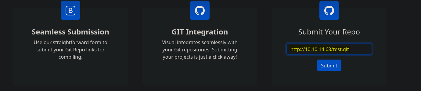 Hemos añadido por causalidad el dominio visual.htb al fichero hosts de nuestro equipo y ahora la web muestra más información que antes…