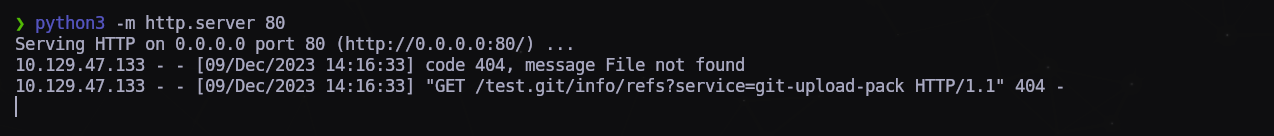 Creamos un archivo .git de prueba (test.git) y levantamos un servidor HTTP con Python para ver qué pasa.